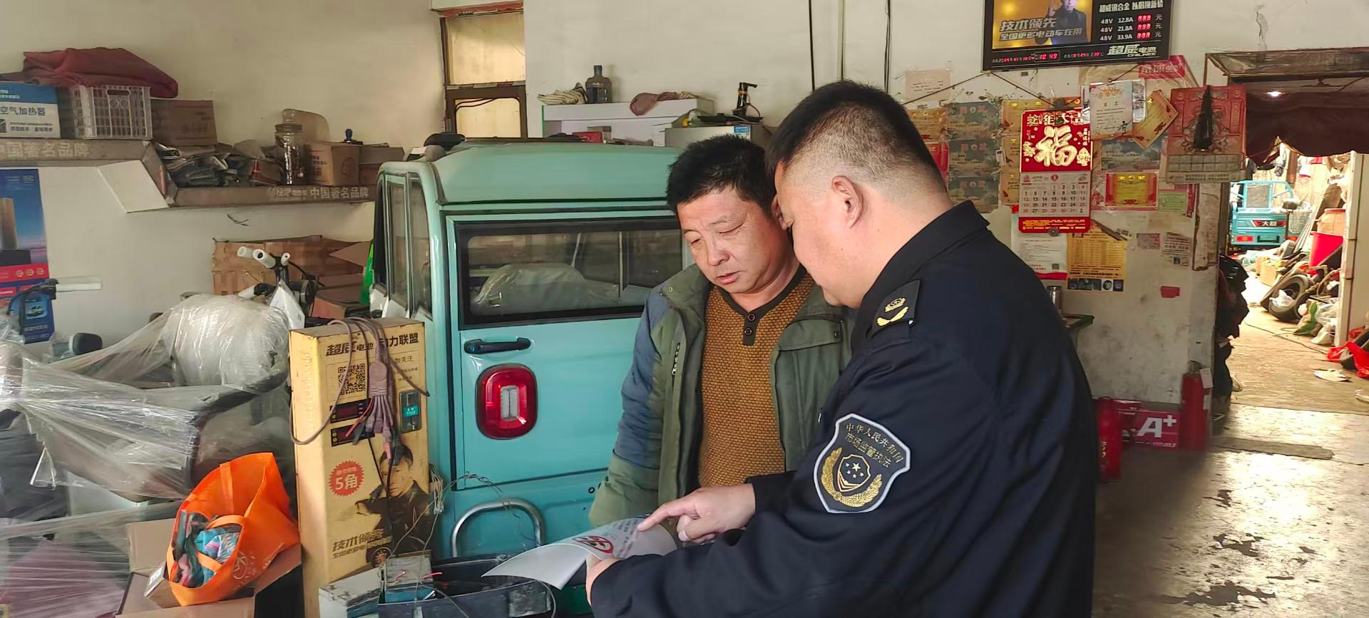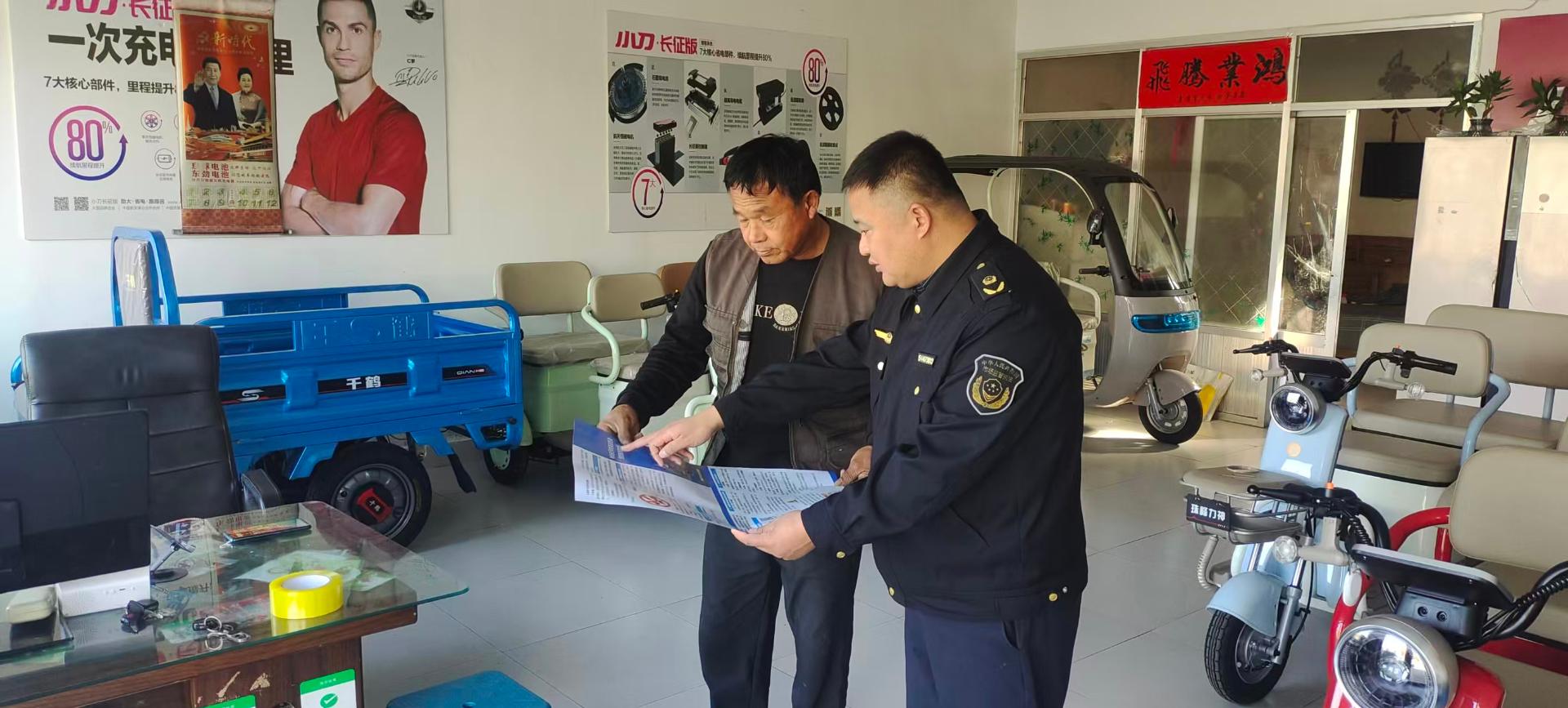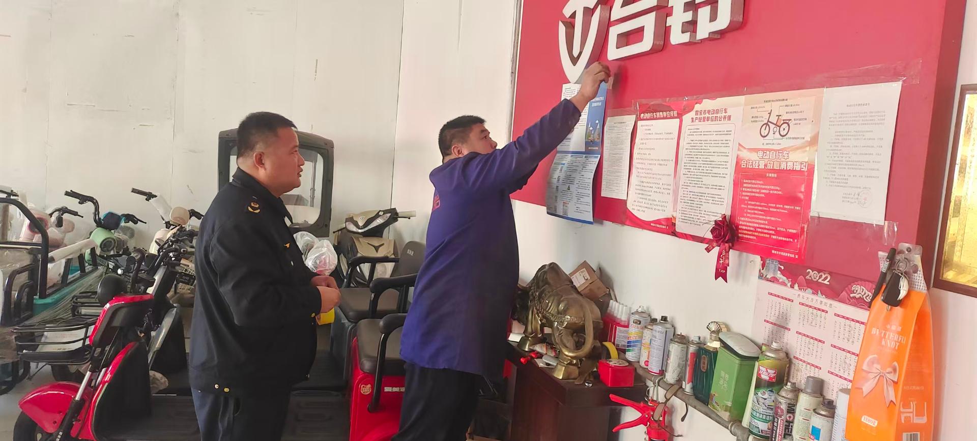 高唐县市场监管局 市场监管 所 对 辖区 电动自行车标准变更及进货查验明白纸发放张贴