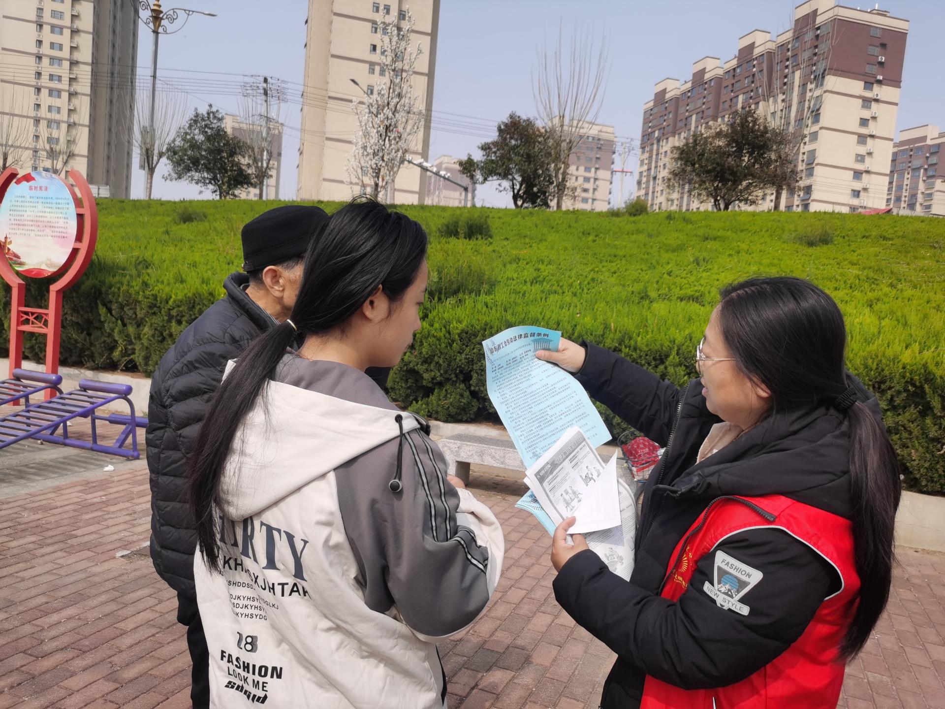 通过组织志愿者广泛宣传《中华人民共和国妇女权益保障法》、《山东省女职工劳动保护办法》等法律法规,增强女职工的法律意识和维权能力,保障妇女同胞的合法权益。