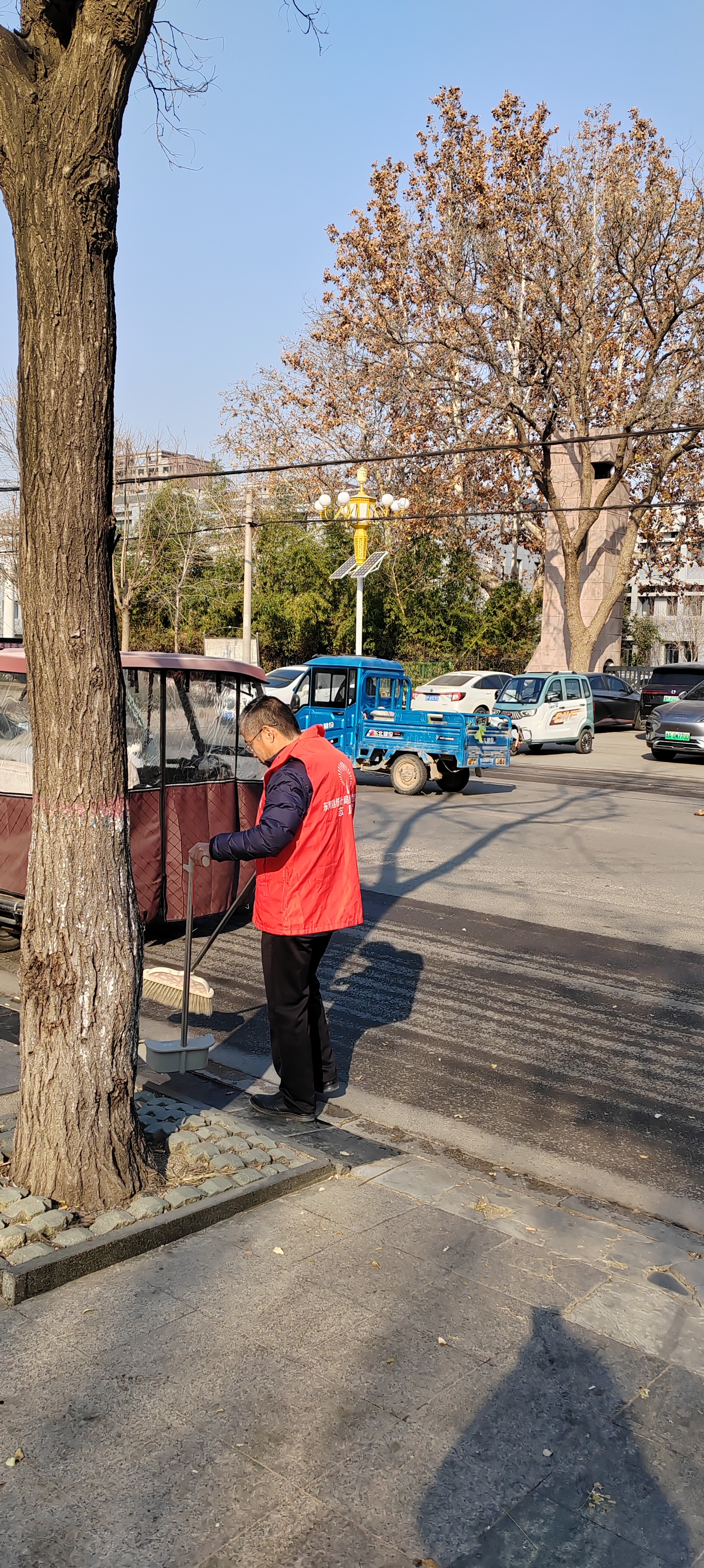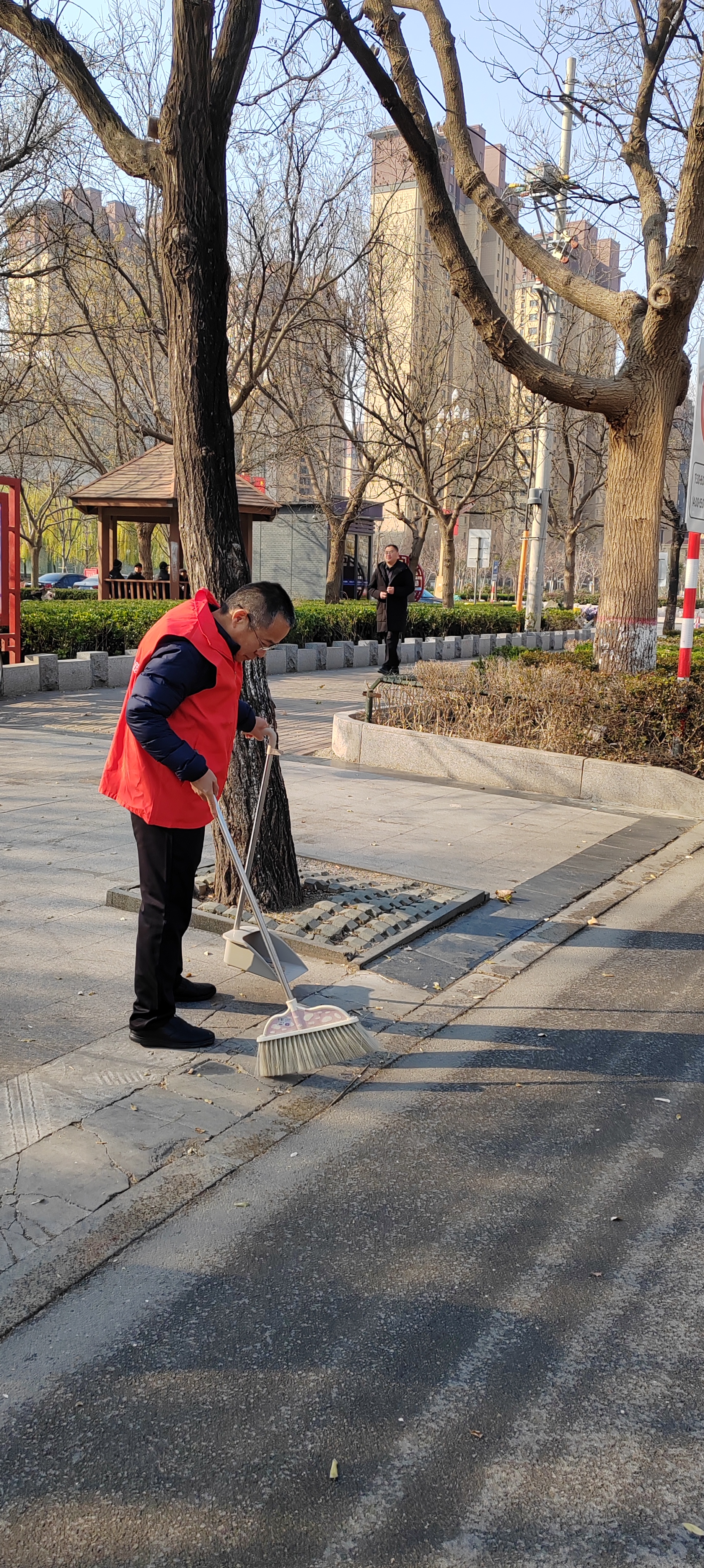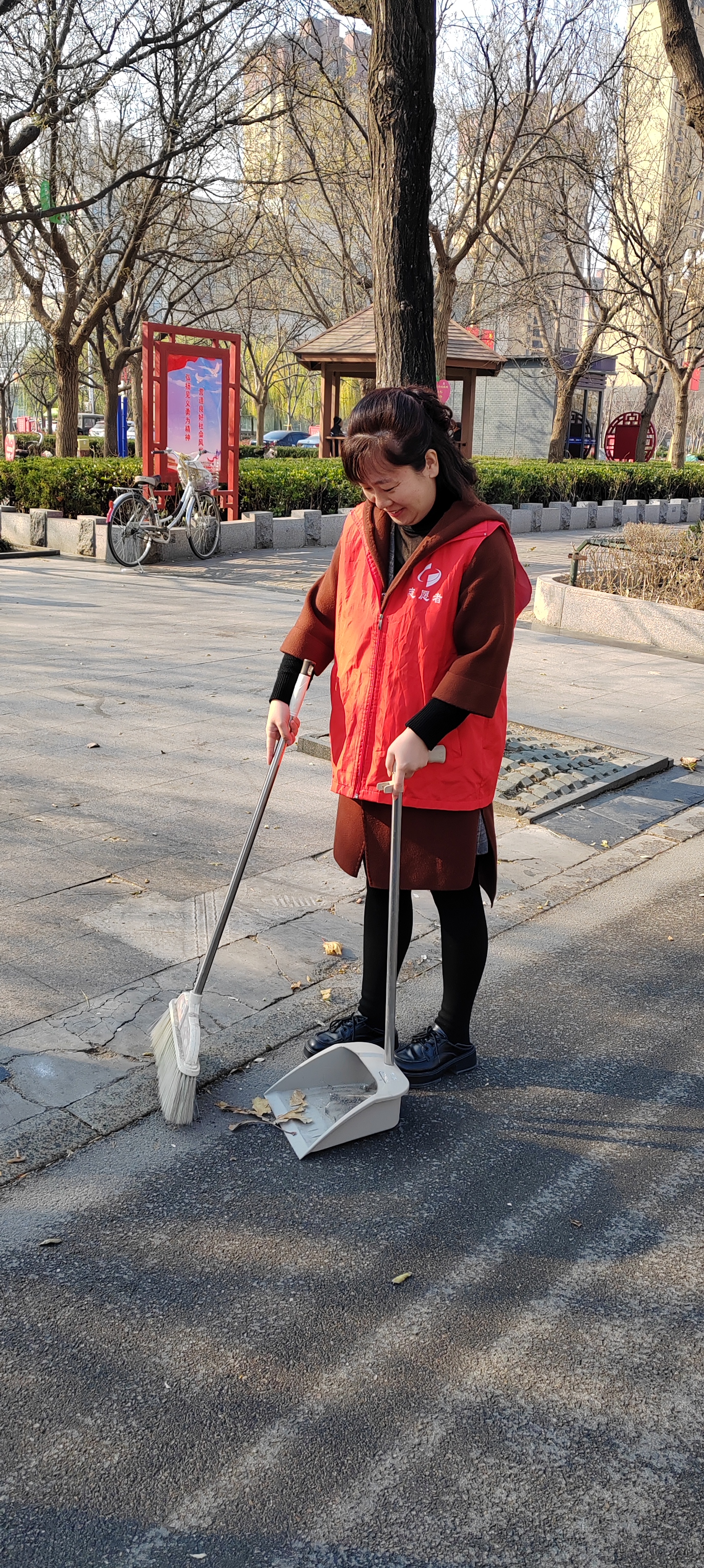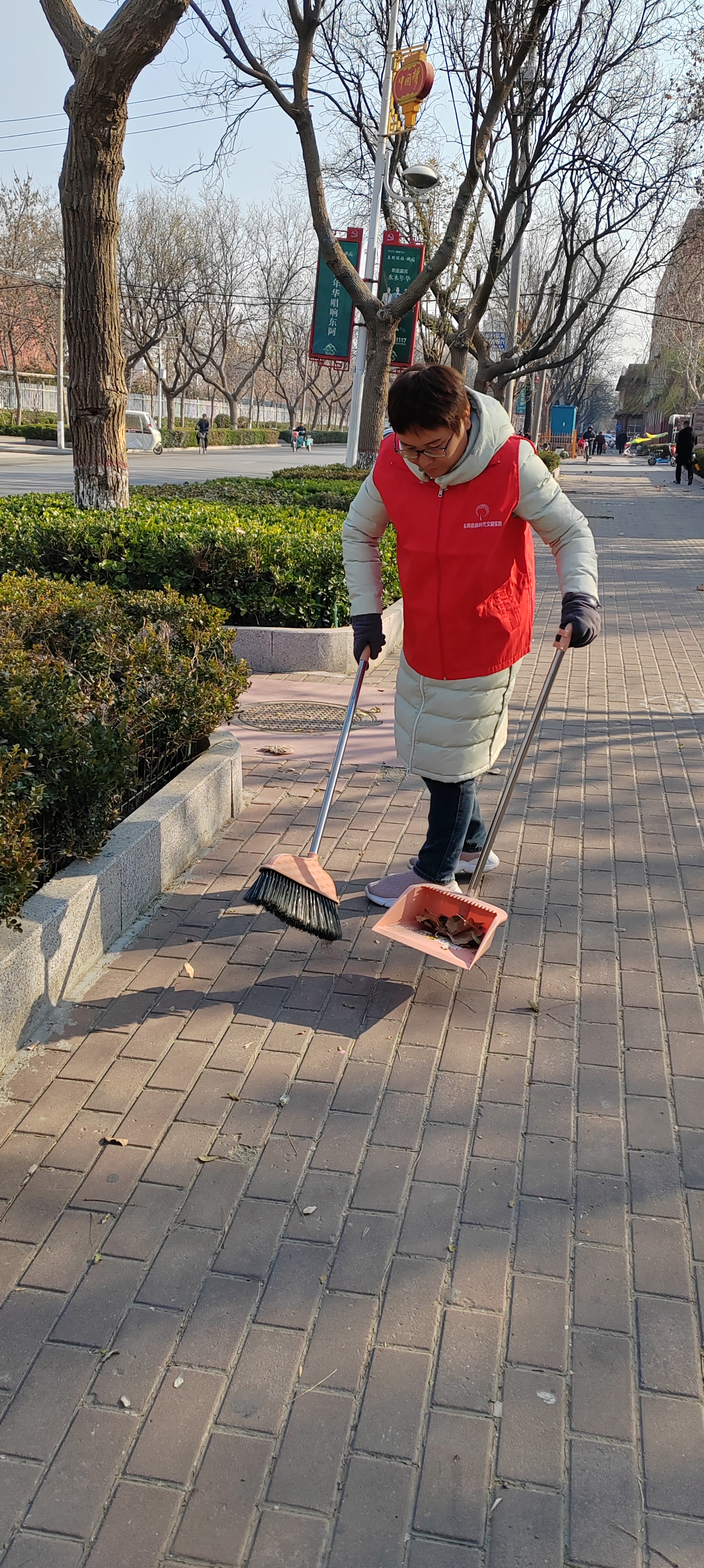 12月5日.统计局志愿者身穿红马甲,在文化街及小广场捡拾垃圾,清扫树叶、烟头等,倒入垃圾桶、垃圾站。 开展保护环境等宣传活动,教育广大市民爱护城市卫生,做文明公民。