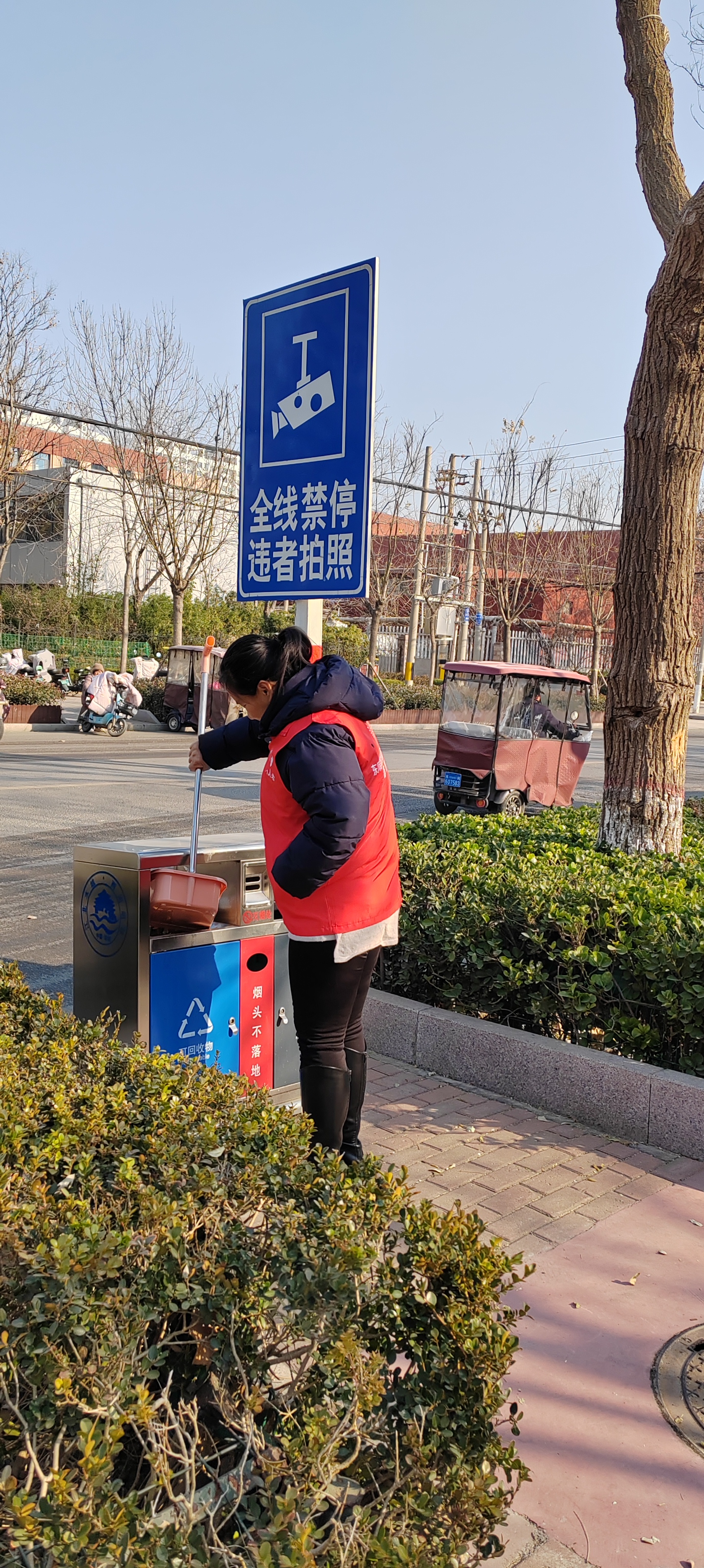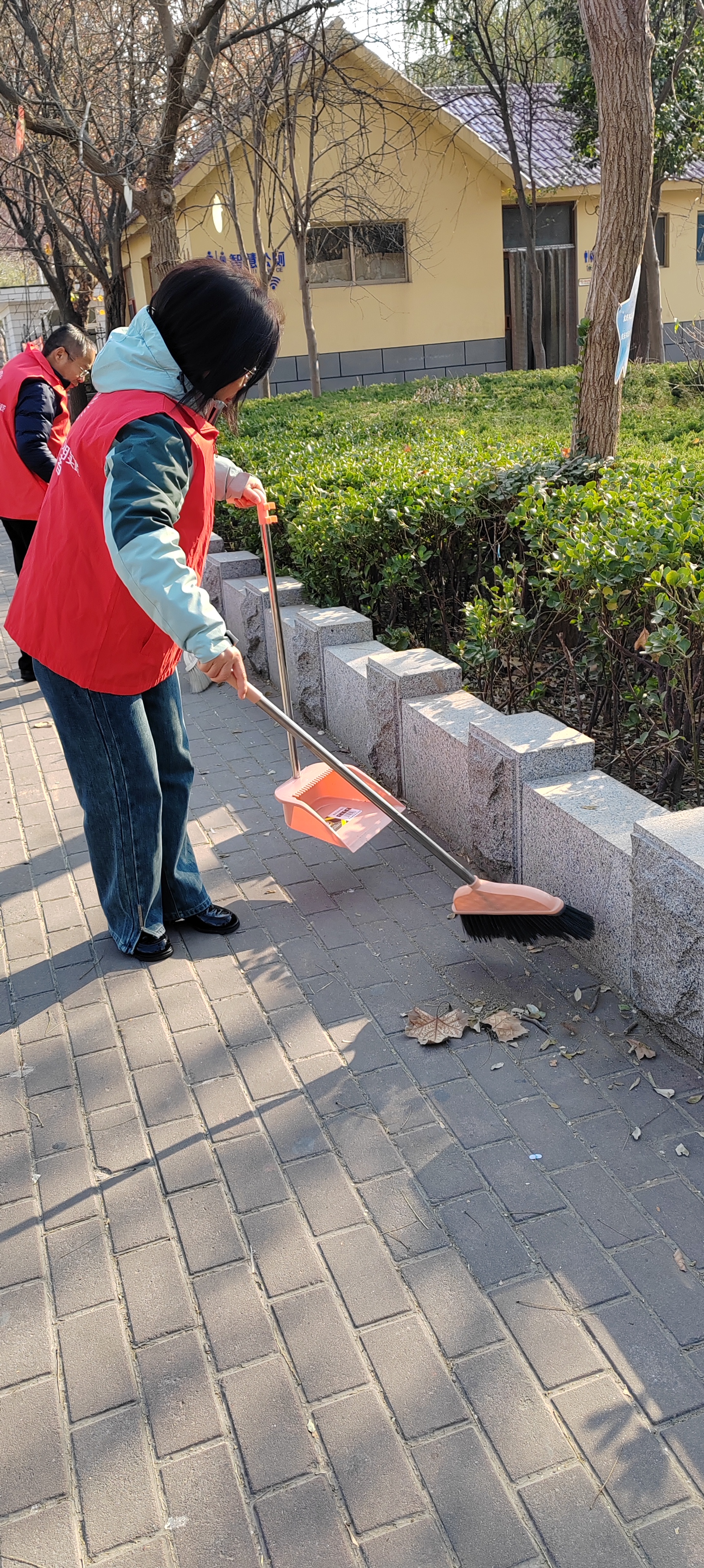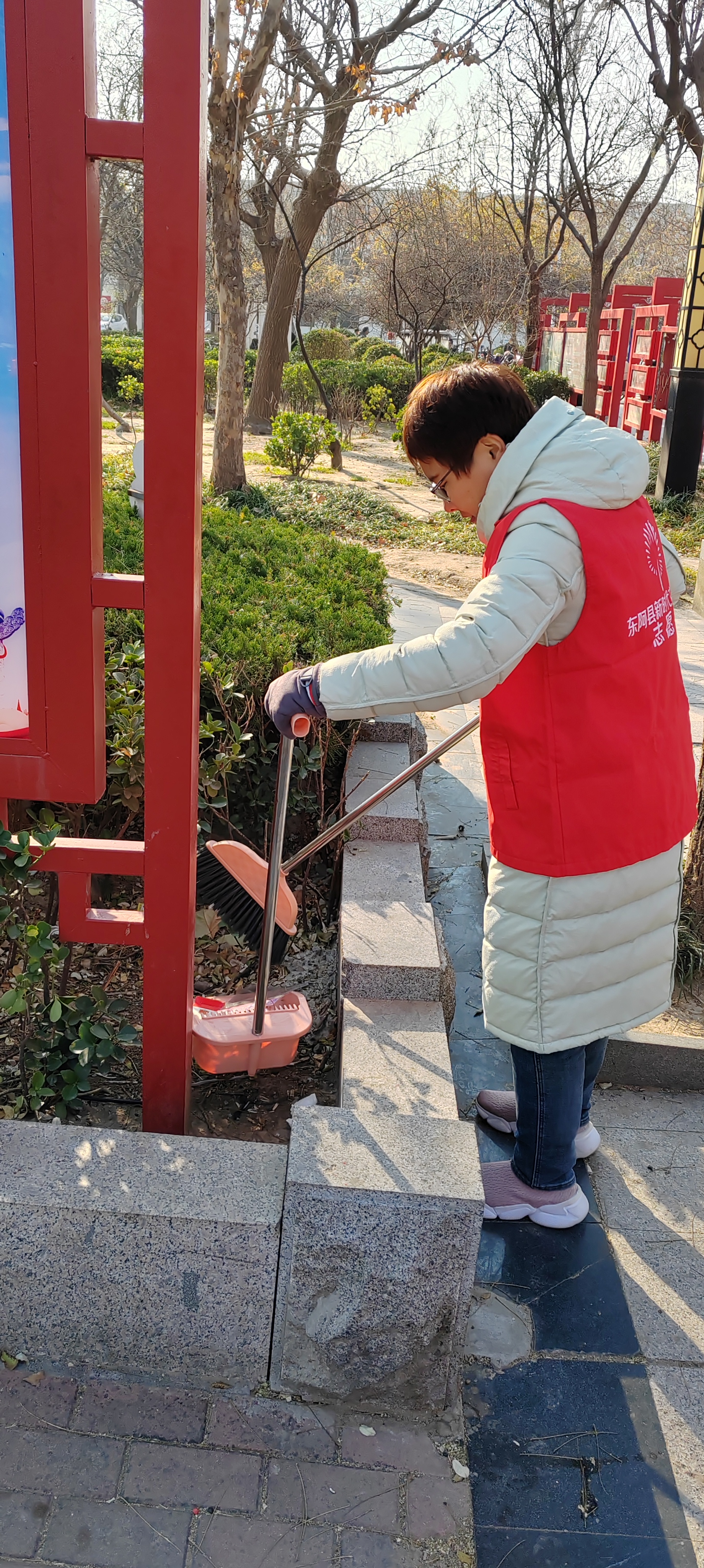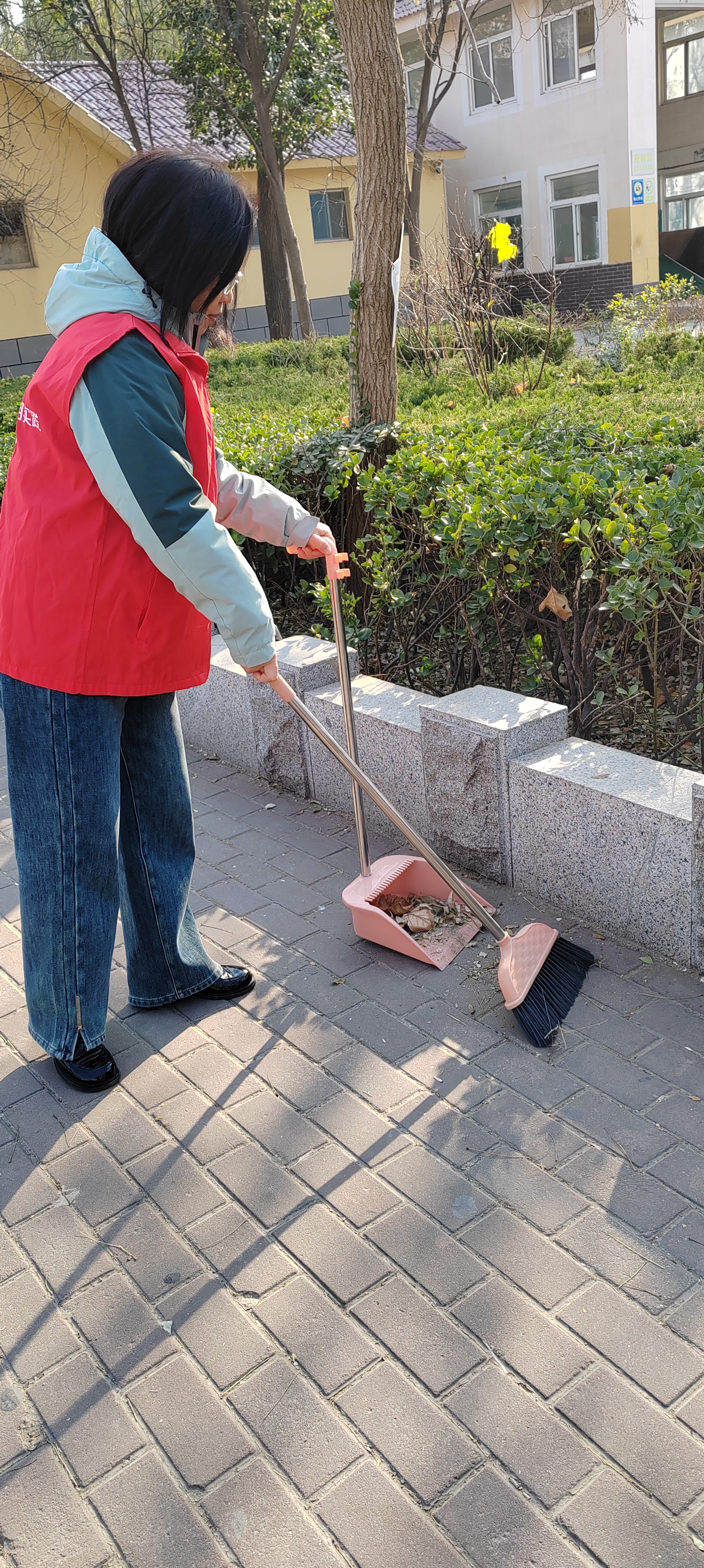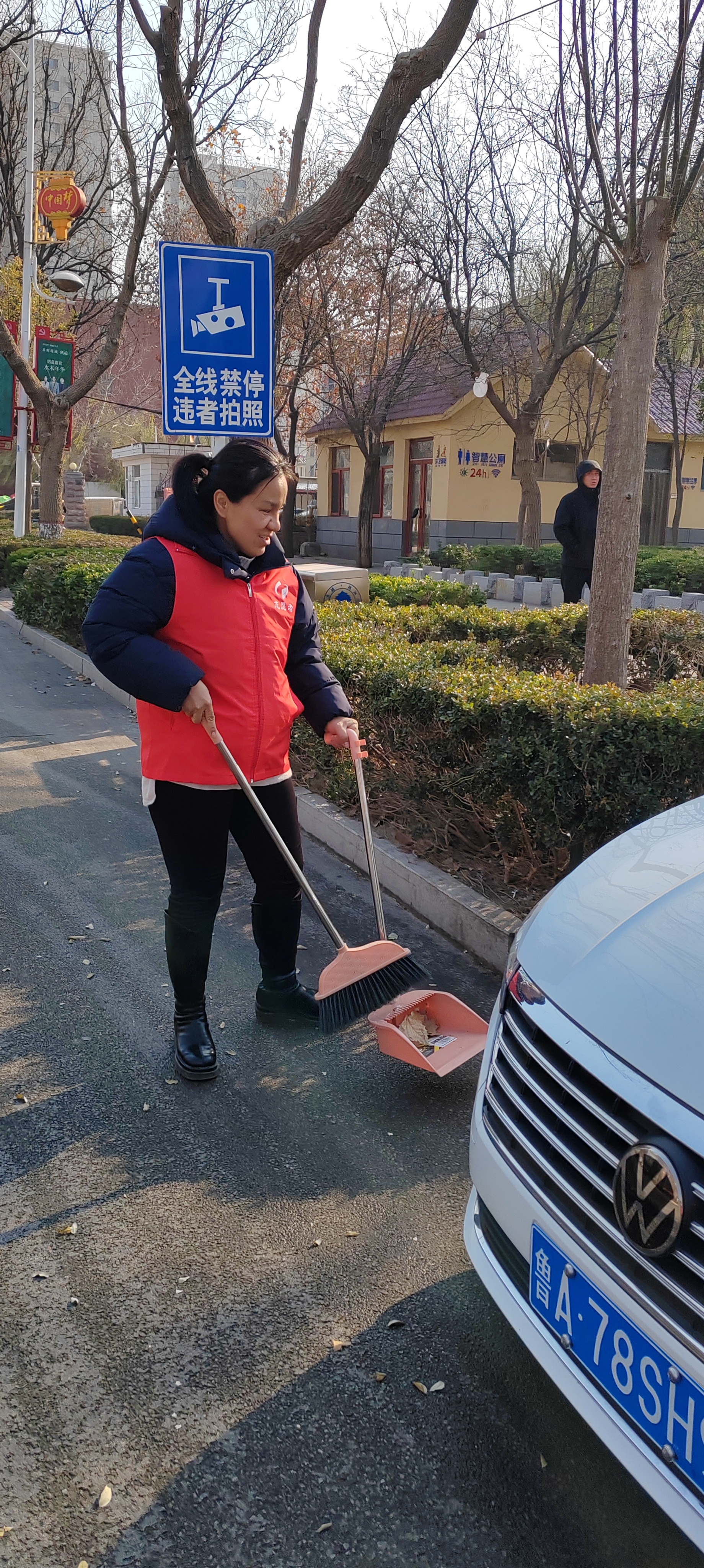 12月5日.统计局志愿者身穿红马甲,在文化街及小广场捡拾垃圾,清扫树叶、烟头等,倒入垃圾桶、垃圾站。 开展保护环境等宣传活动,教育广大市民爱护城市卫生,做文明公民。