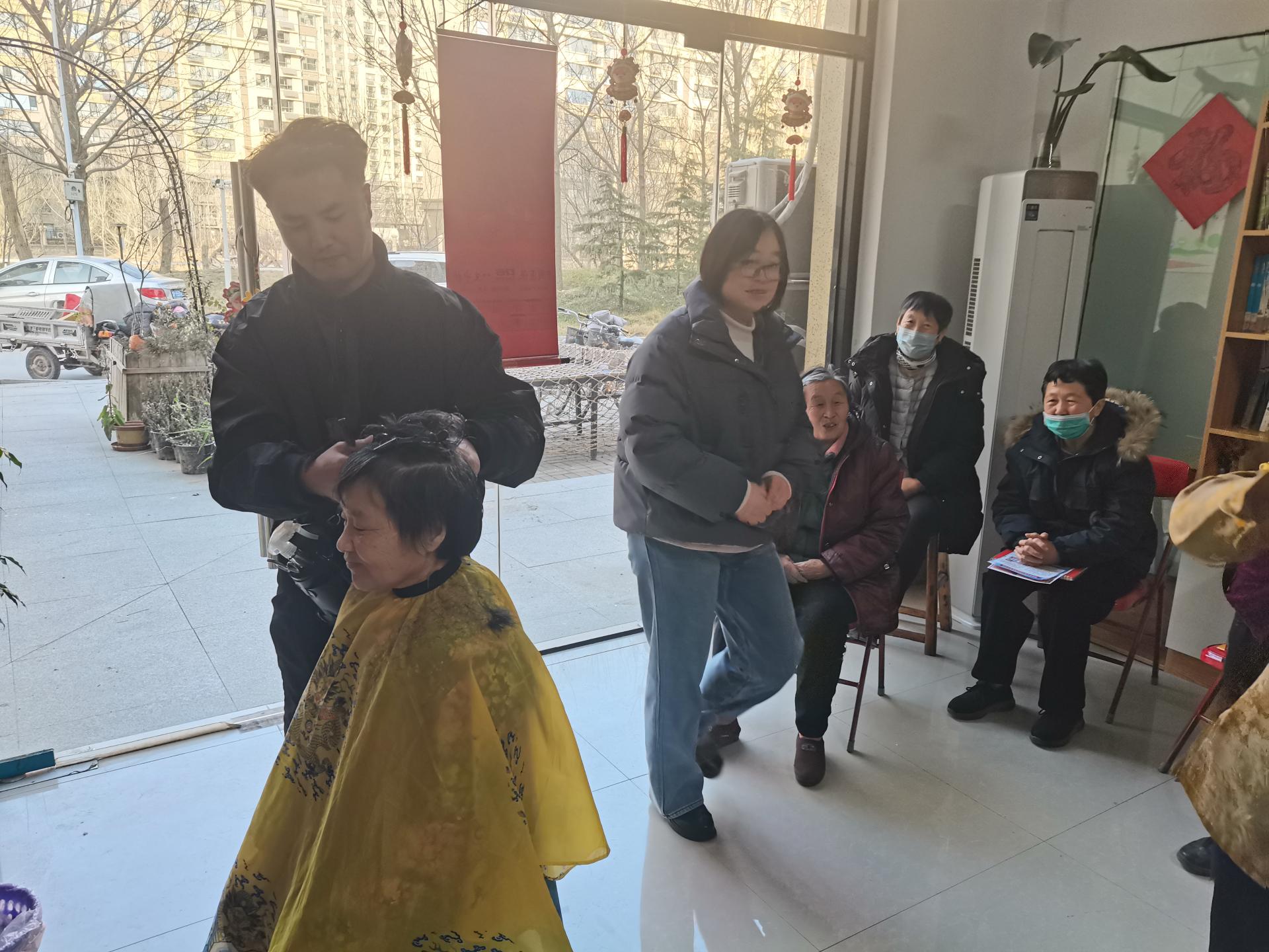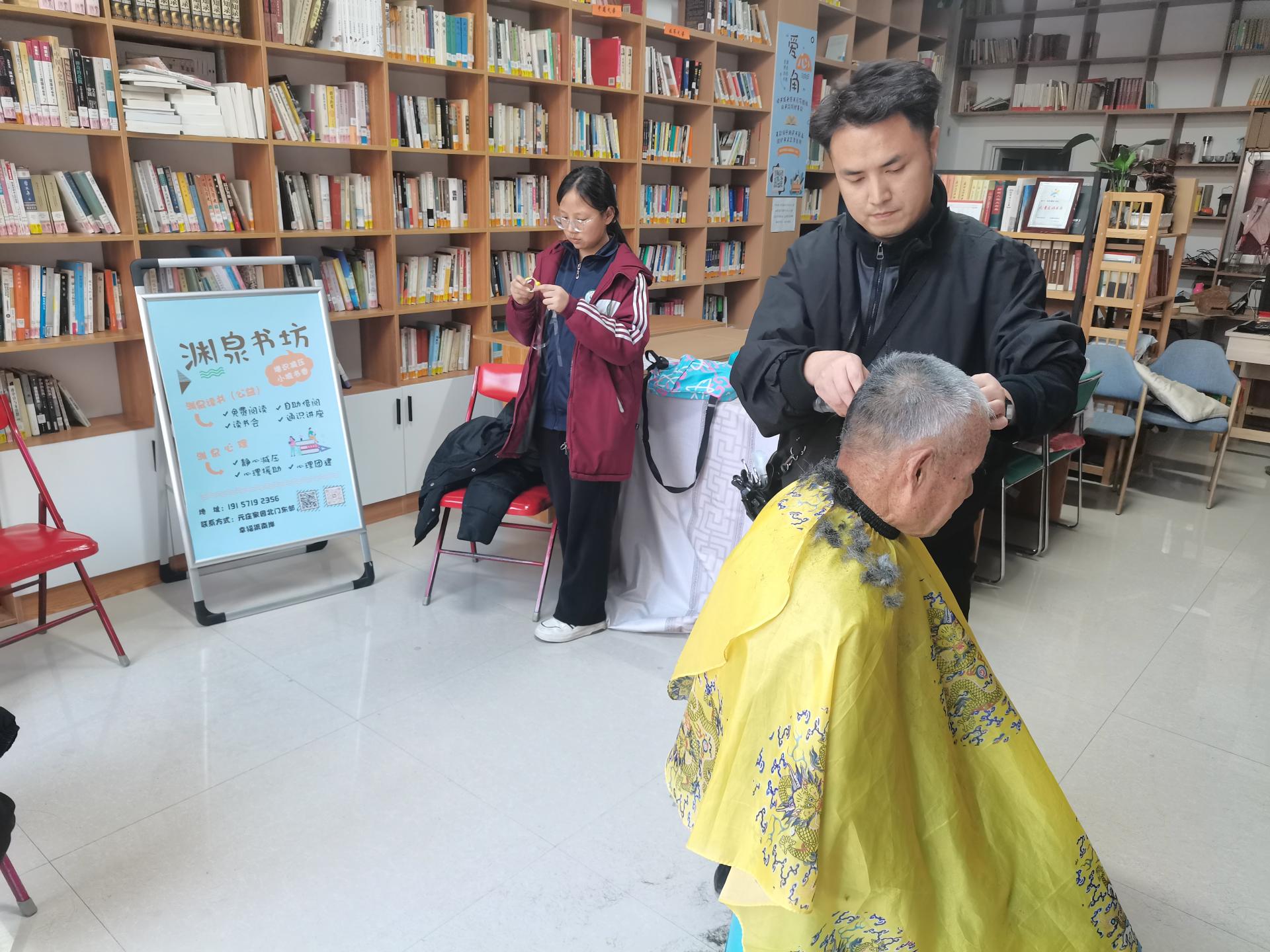 武训社区邀请最美爱心商家专业理发师在渊泉书坊为居民现场服务,免费为居民修剪发型,方便邻里,传递温暖。