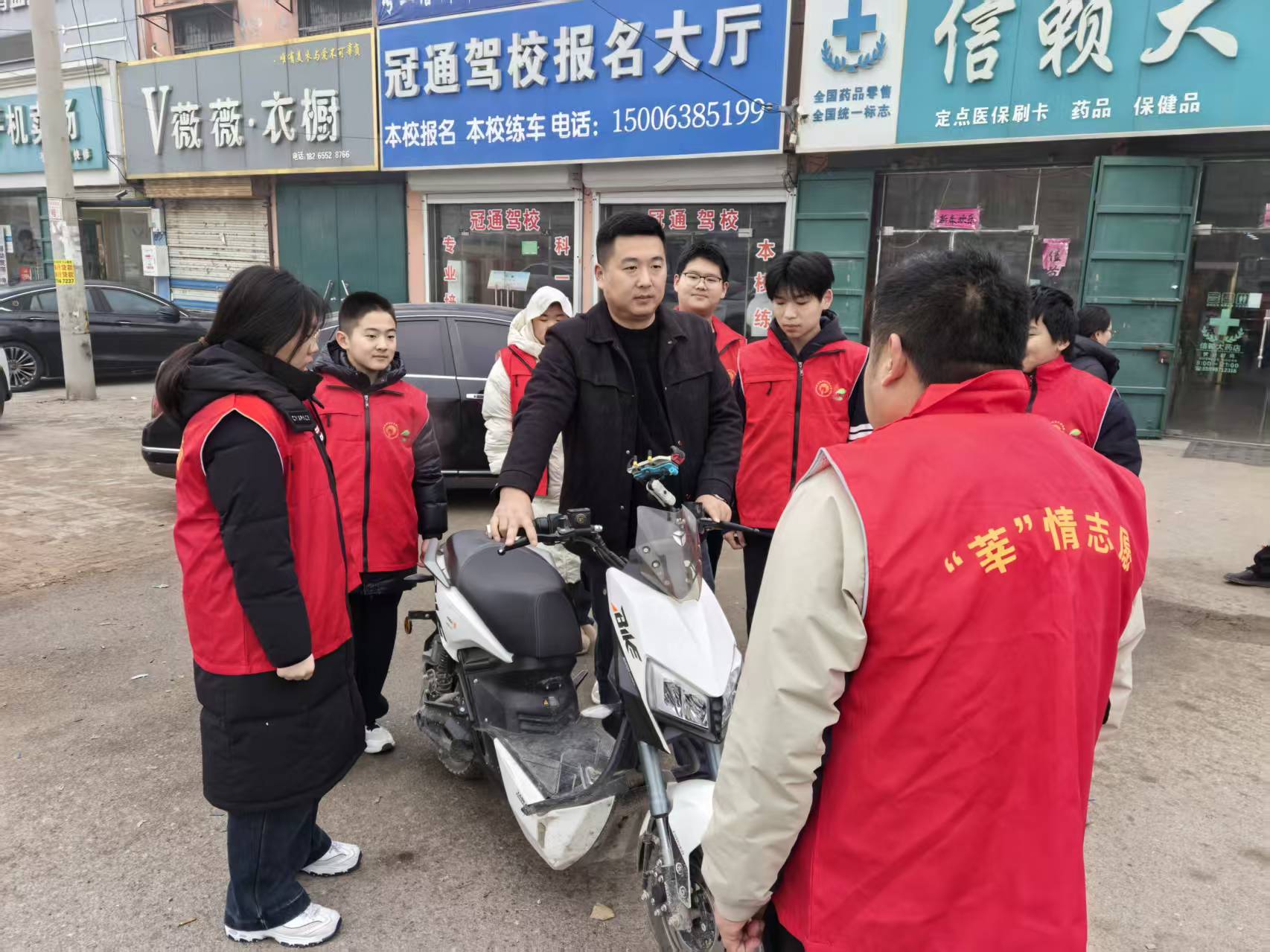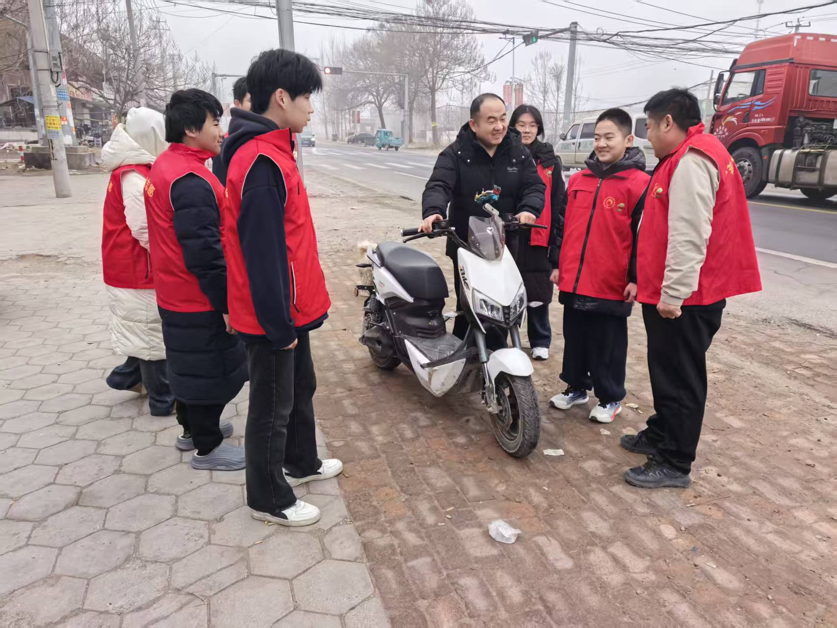 组织学生们化身为"小小交通安全宣传员",分发佩戴头盔倡议书。向过往的电动车、摩托车驾驶员讲解不戴头盔的危险。用简单易懂的语言普及正确佩戴头盔的重要性,提醒大家安全出行。