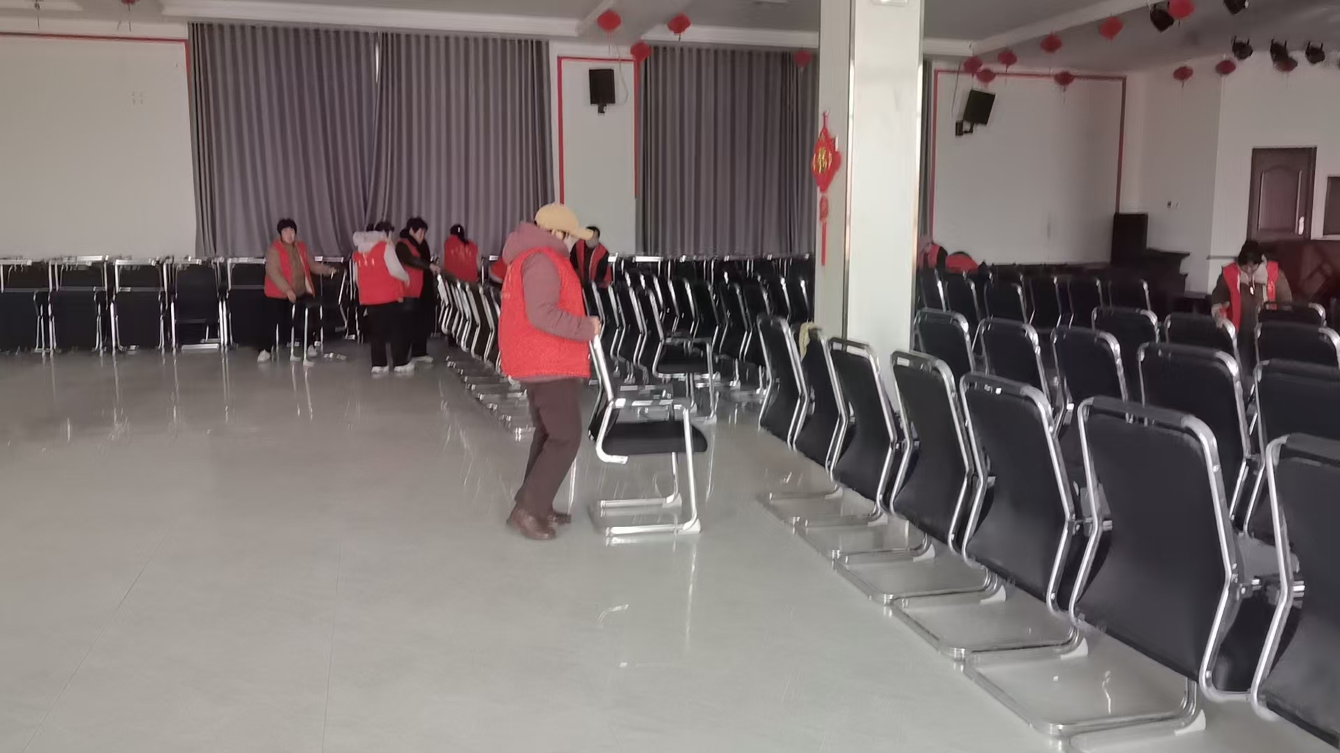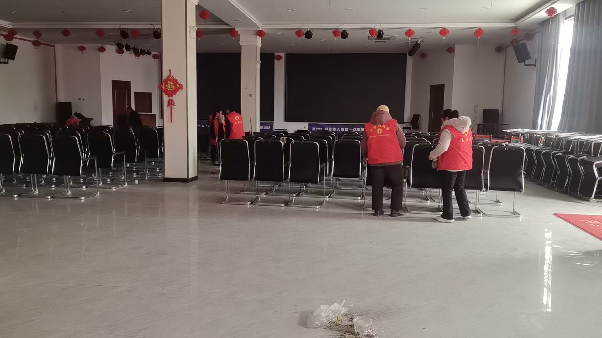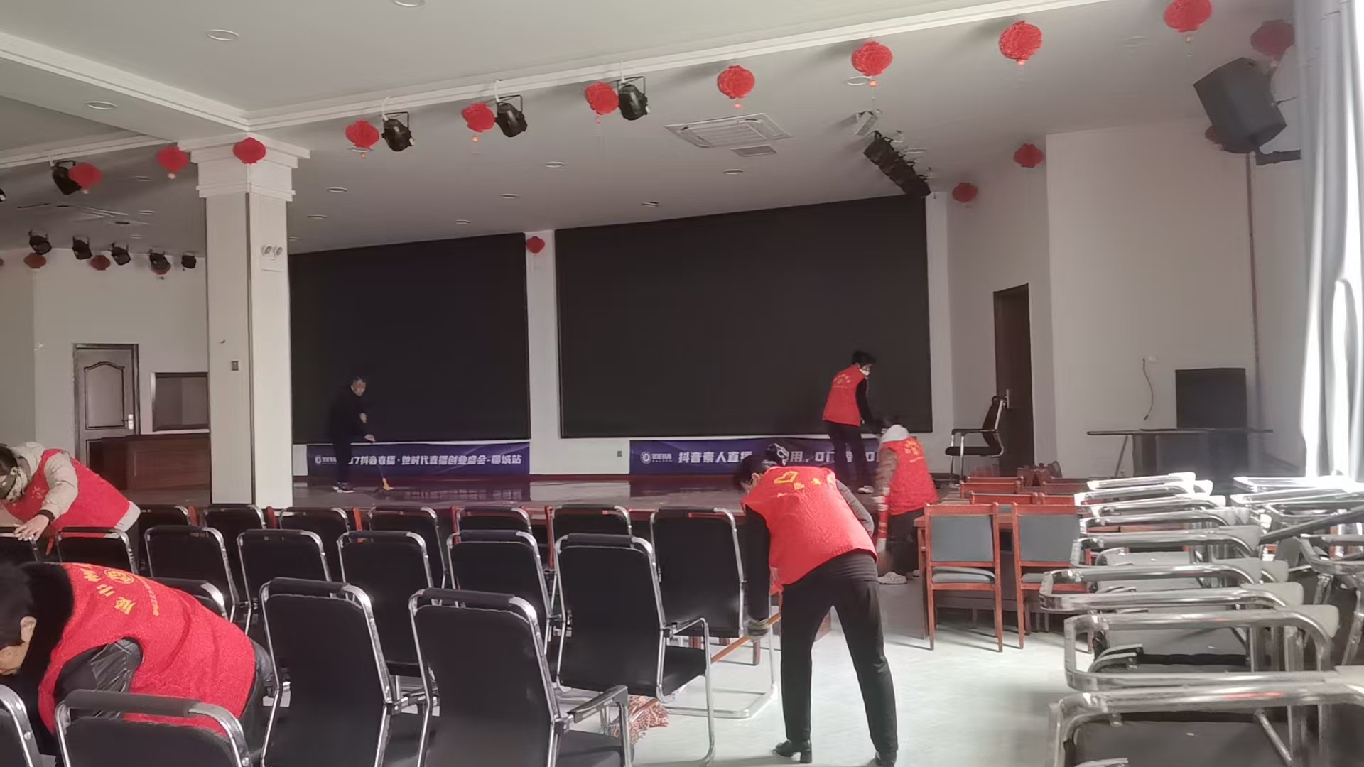 十里营社区志愿服务队在前八村多功能放映厅整理桌椅 打扫卫生 清洁设备 优化活动场地并积极进行一系列志愿服务活动