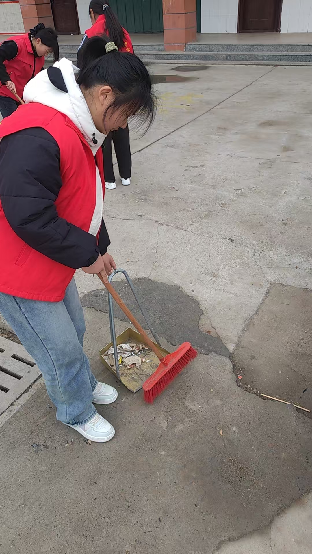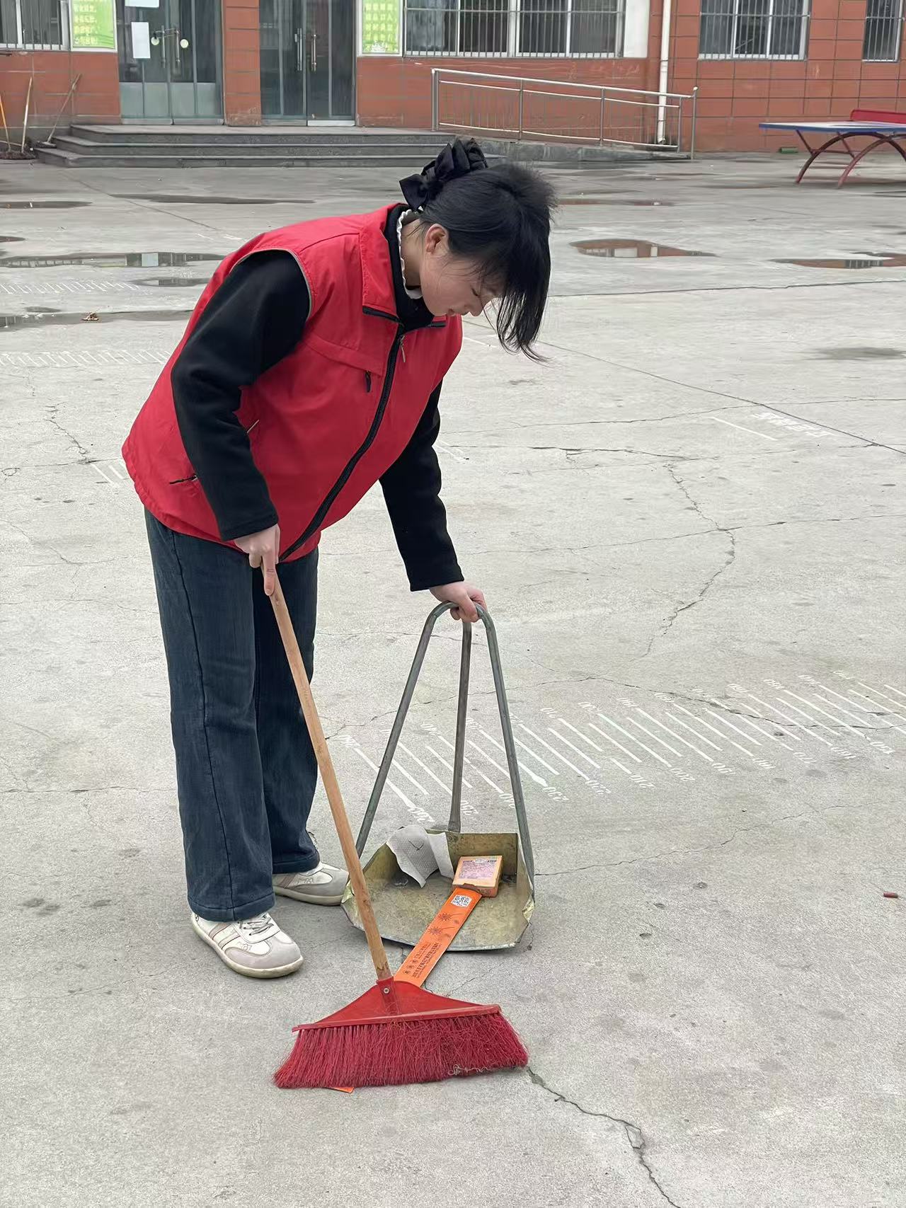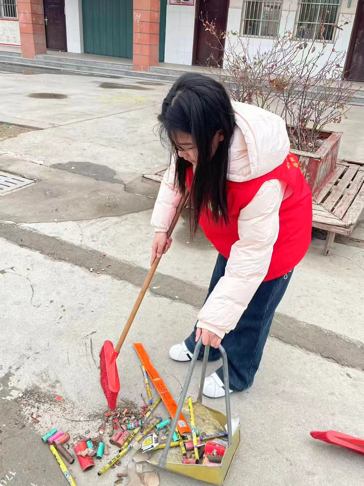 志愿者清扫校园、整理环境,培养劳动习惯与责任意识,引导青少年从小事做起,树立正确价值观,争做文明中学生