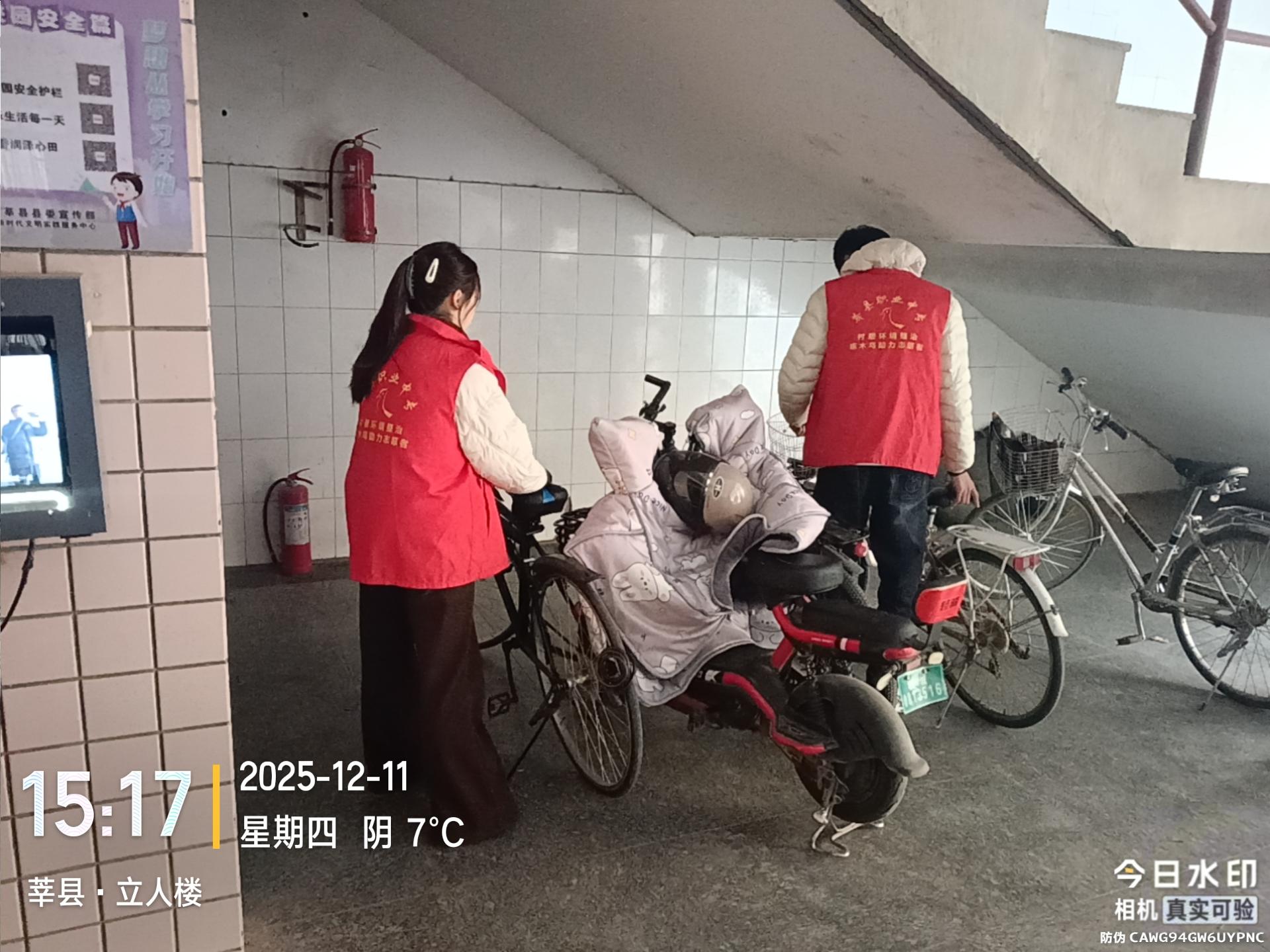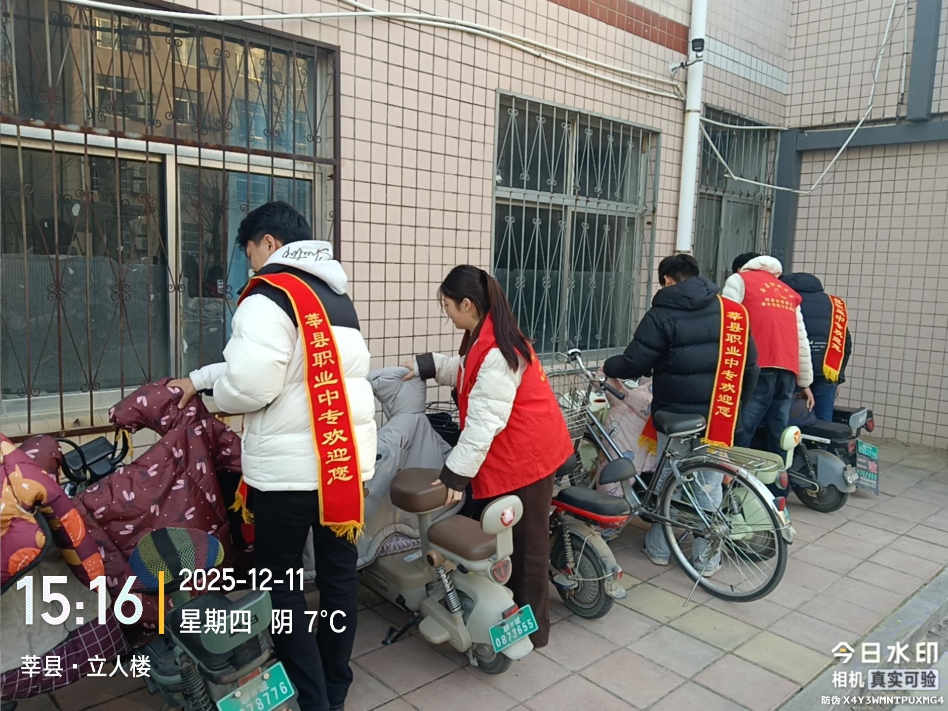 为职专学生停车位划分,指导学生有序停车,为学生宣讲骑车路上佩戴头盔的必要性,遵守交通规则,安全第一。