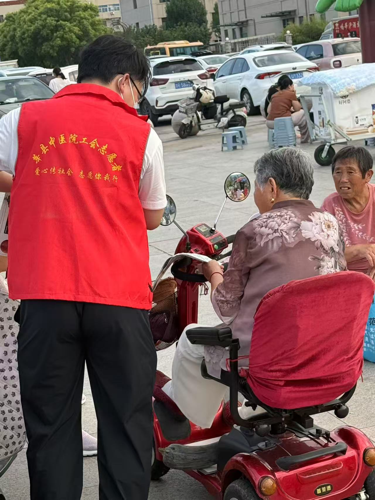 志愿者穿戴好红马甲,携带好宣传材料及设备,按时到达活动地点,以专业的技术,热情的服务为市民做好义诊服务。