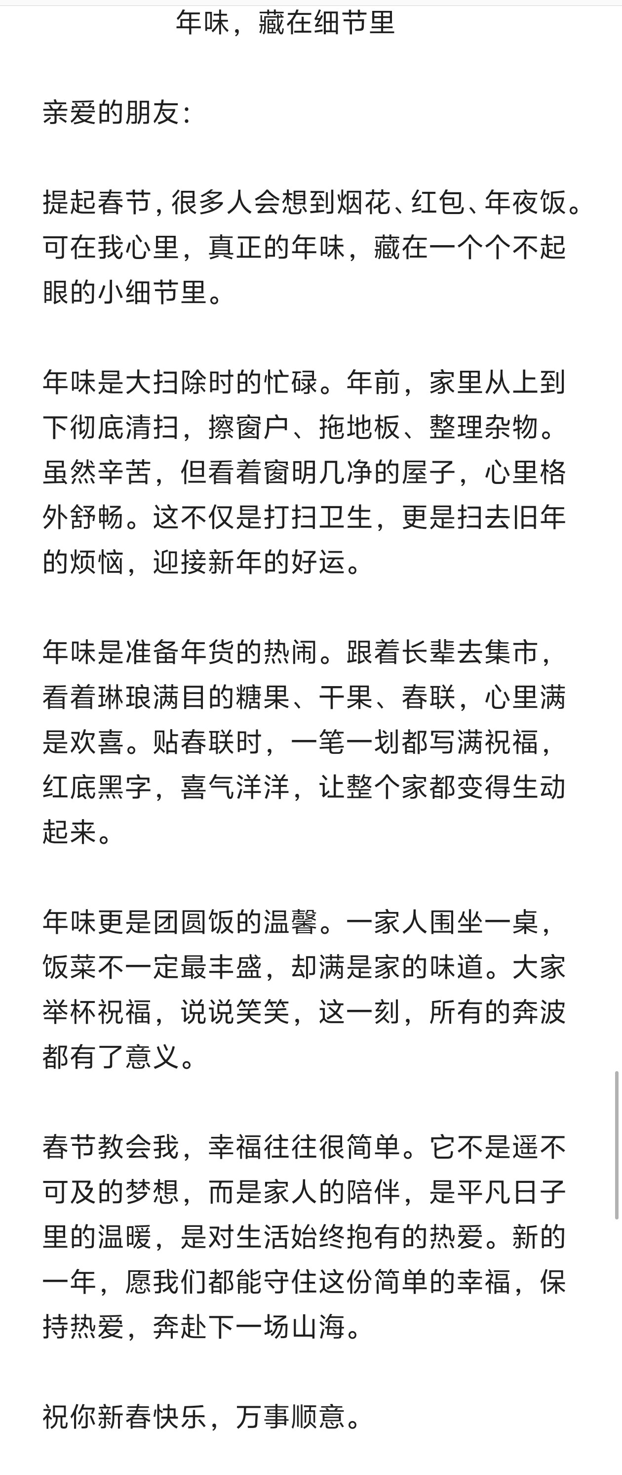 作品需围绕新的一年的人、事、物展开,末尾需体现自己新一年的寄语。体裁不限,字数在1000字以内,内容不得含有违背法律规定和公序良俗的标识。