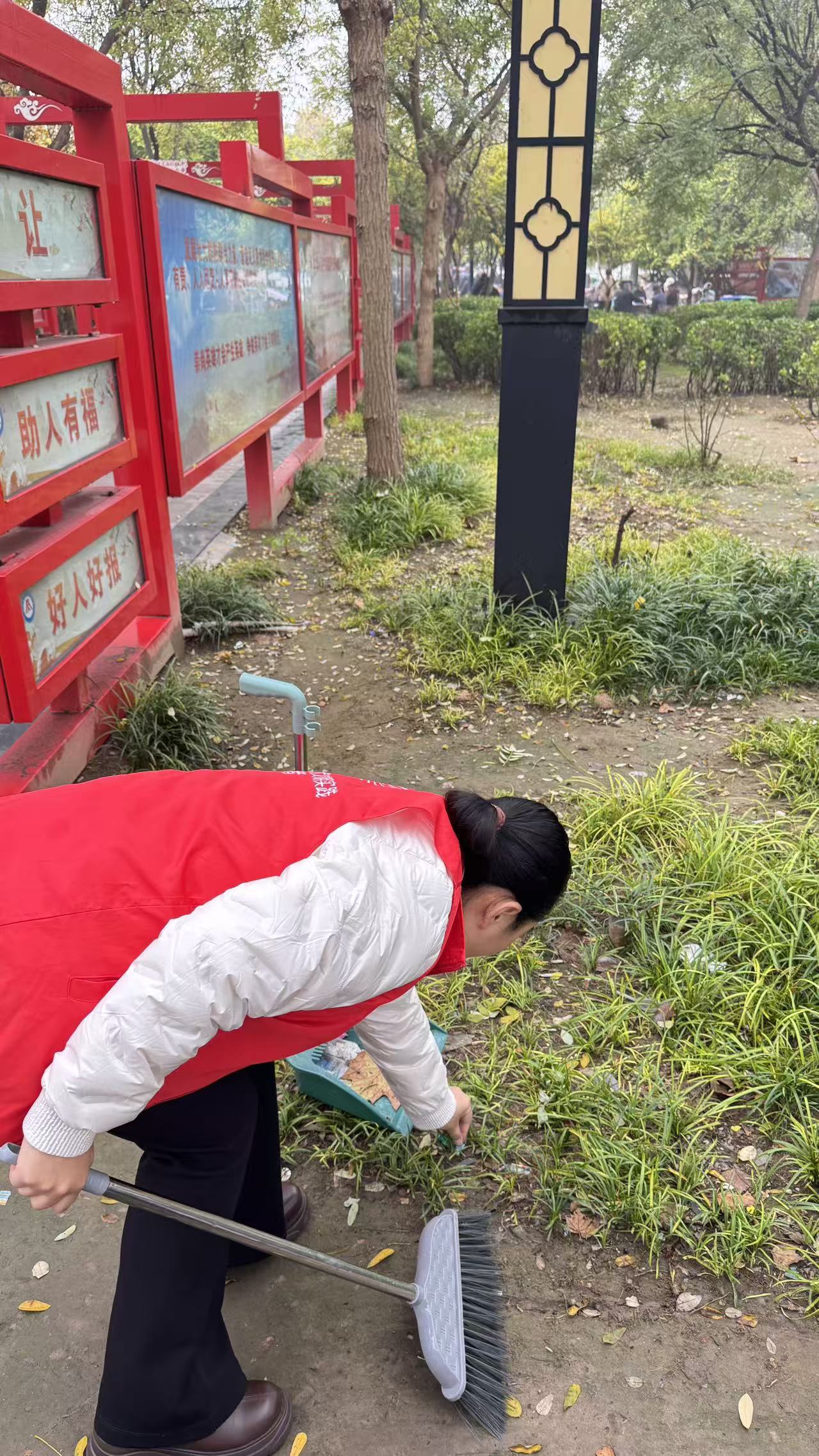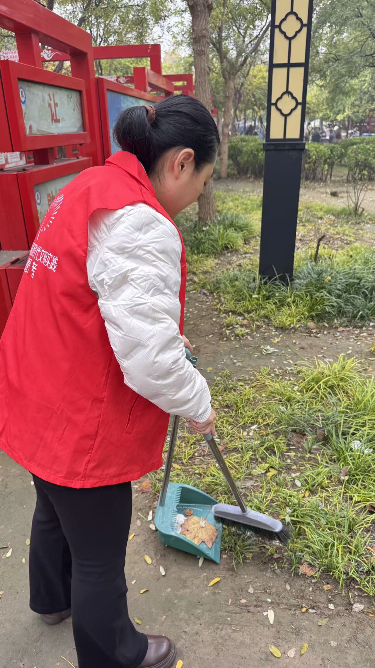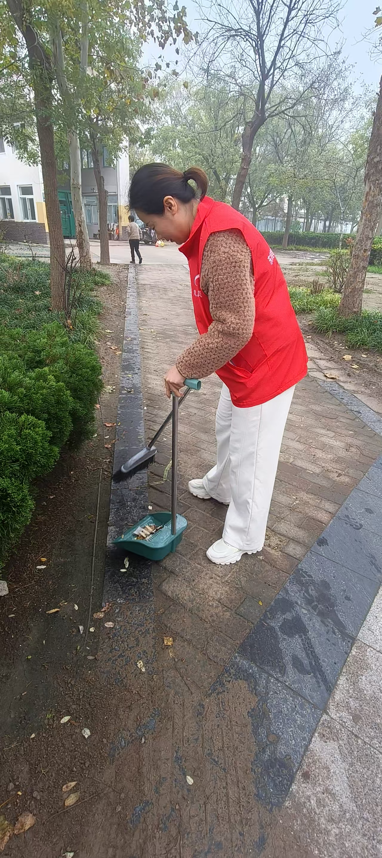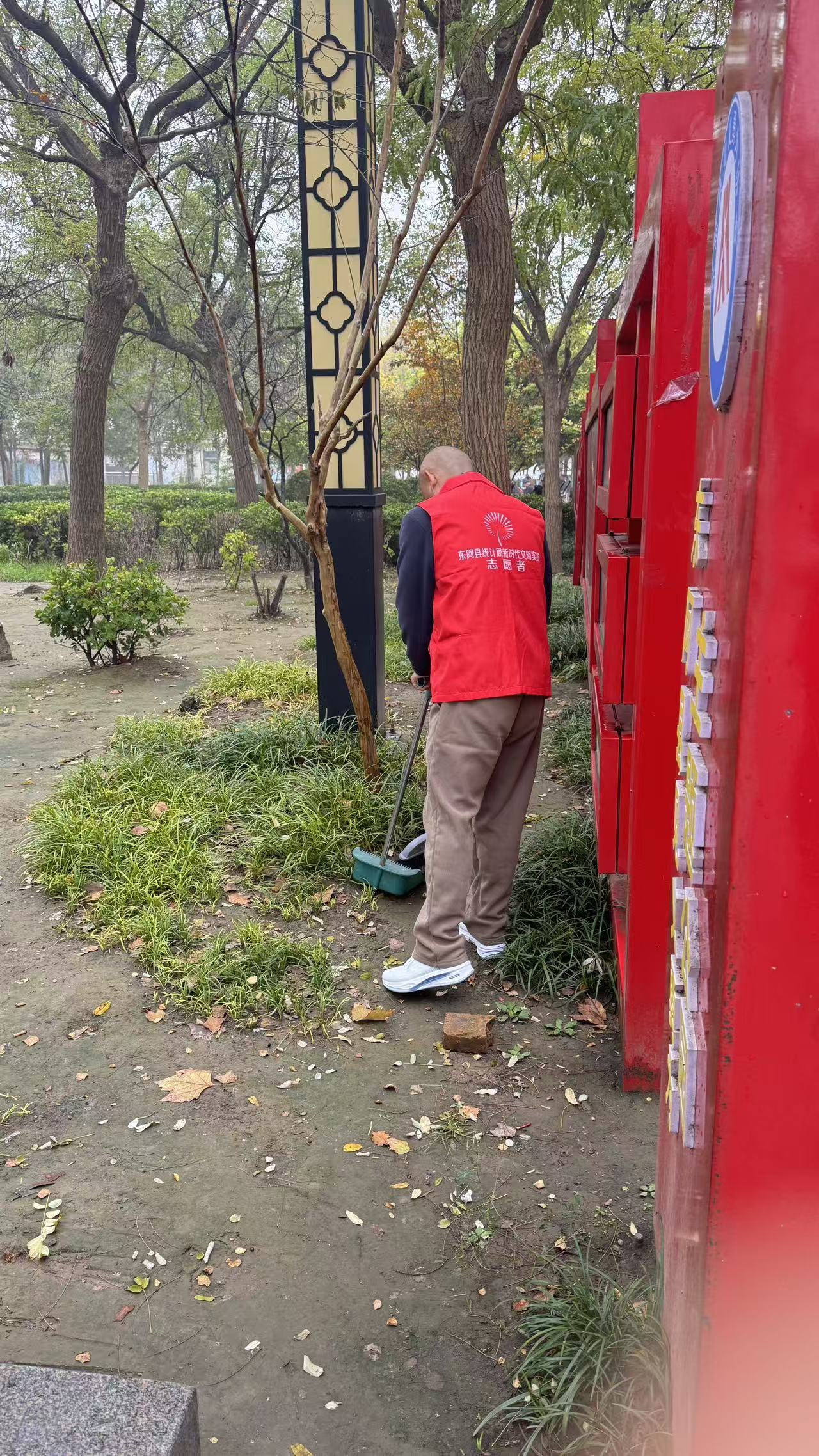 10月31日,东阿县统计局志愿者身穿红马甲,在文化街捡拾垃圾,清扫树叶、烟头等,倒入垃圾桶、垃圾站。