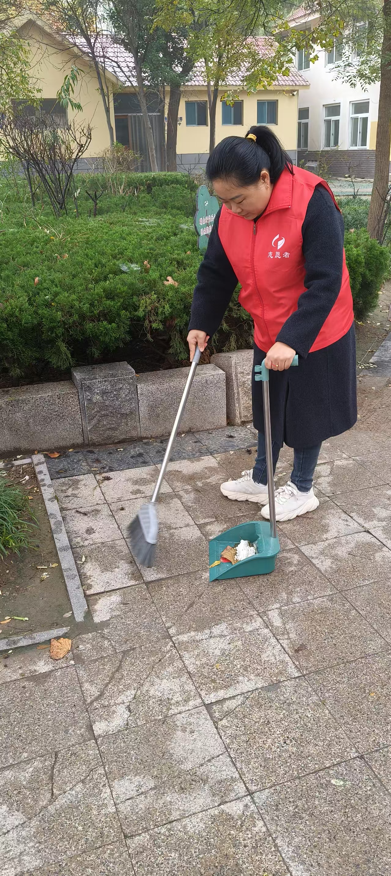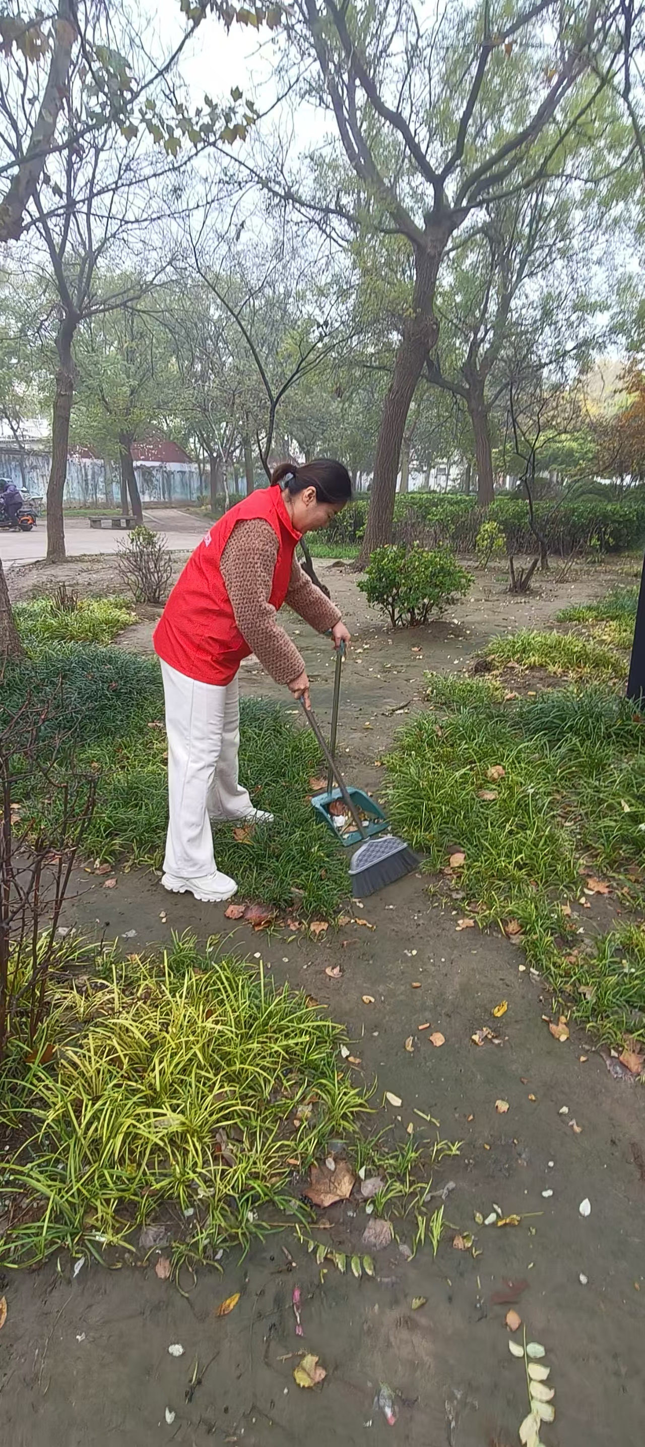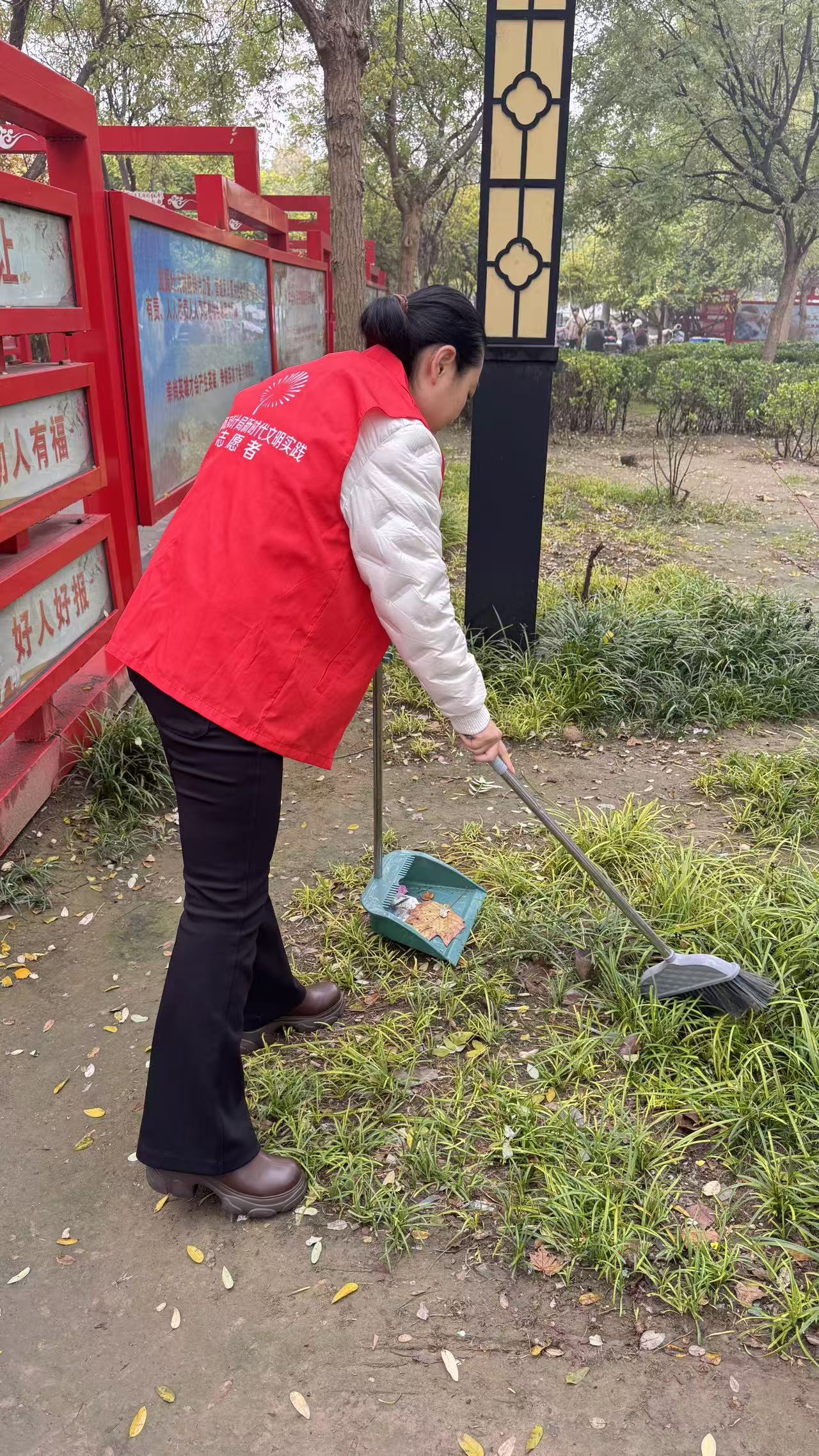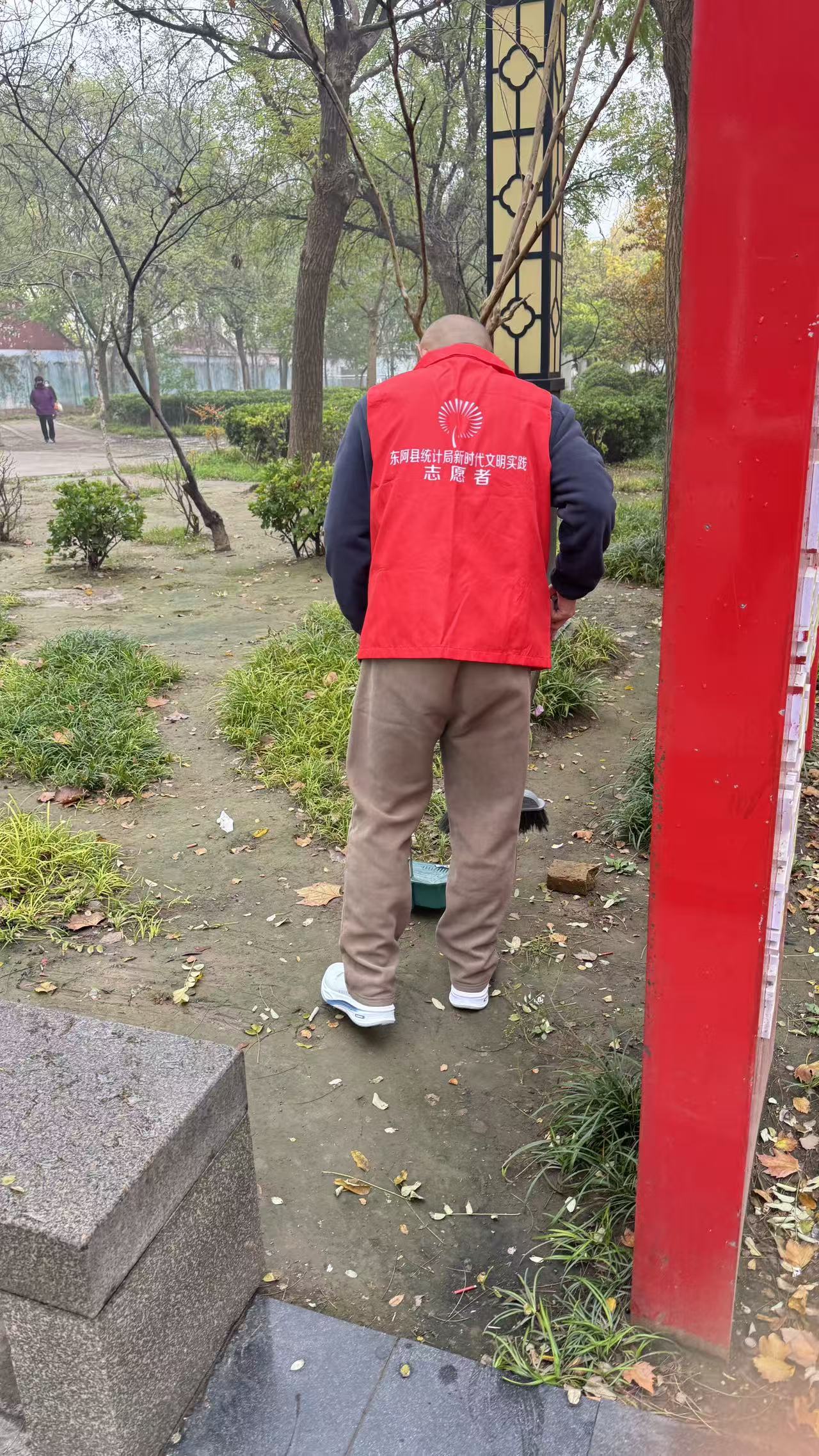 10月31日,东阿县统计局志愿者身穿红马甲,在文化街捡拾垃圾,清扫树叶、烟头等,倒入垃圾桶、垃圾站。
