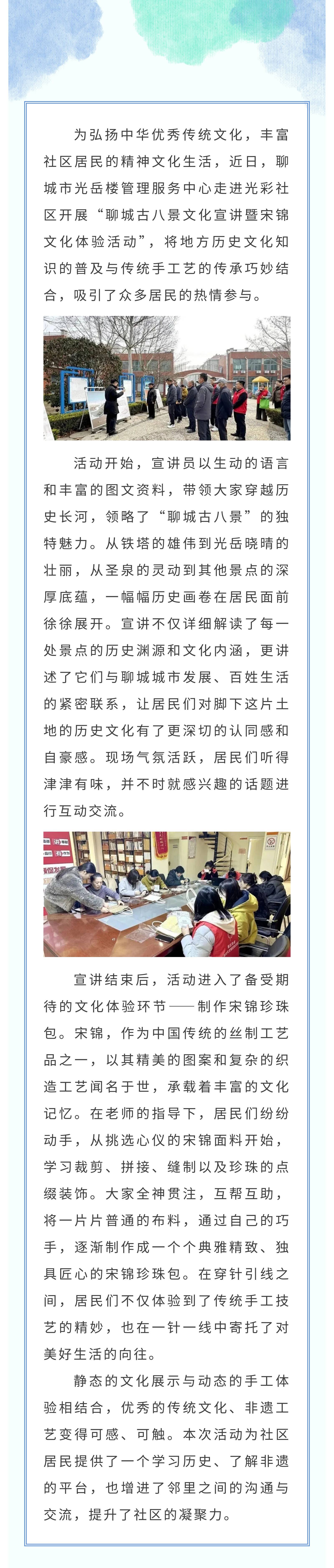 【文明东昌府·书院新貌】文化社区|“聊城古八景”文化宣讲暨宋锦文化体验活动走进东昌府区光彩社区